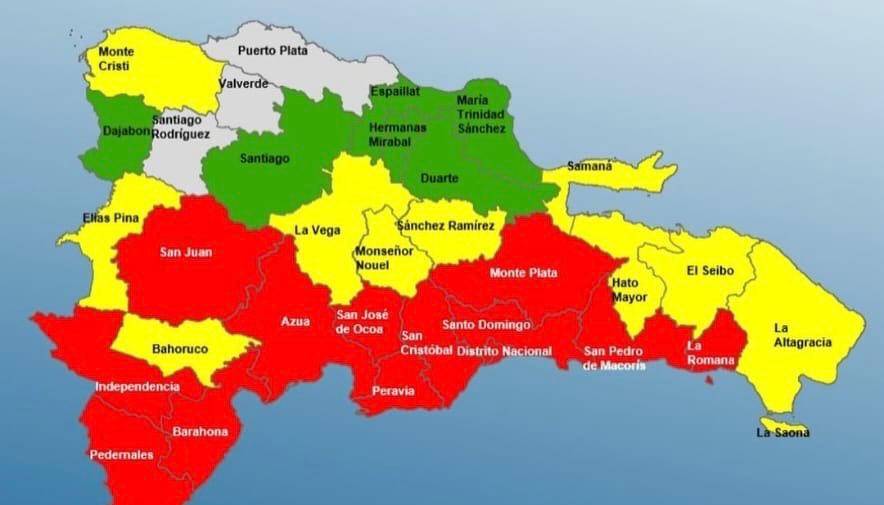 Las demarcaciones en alerta roja figuran: Barahona, San Cristóbal, Santo Domingo, Distrito Nacional, San José de Ocoa, San Pedro de Macorís, Independencia, San Juan, Azúa, Peravia, Pedernales, La Romana y Monte Plata.