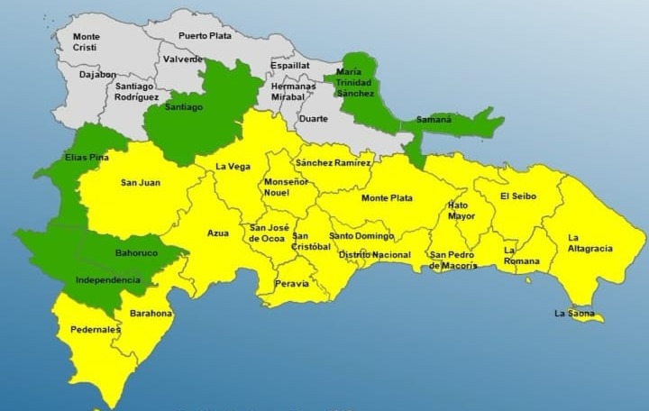 En alerta verde están: María Trinidad Sánchez, Bahoruco, Samaná, Santiago, Independencia y Elías Piña.