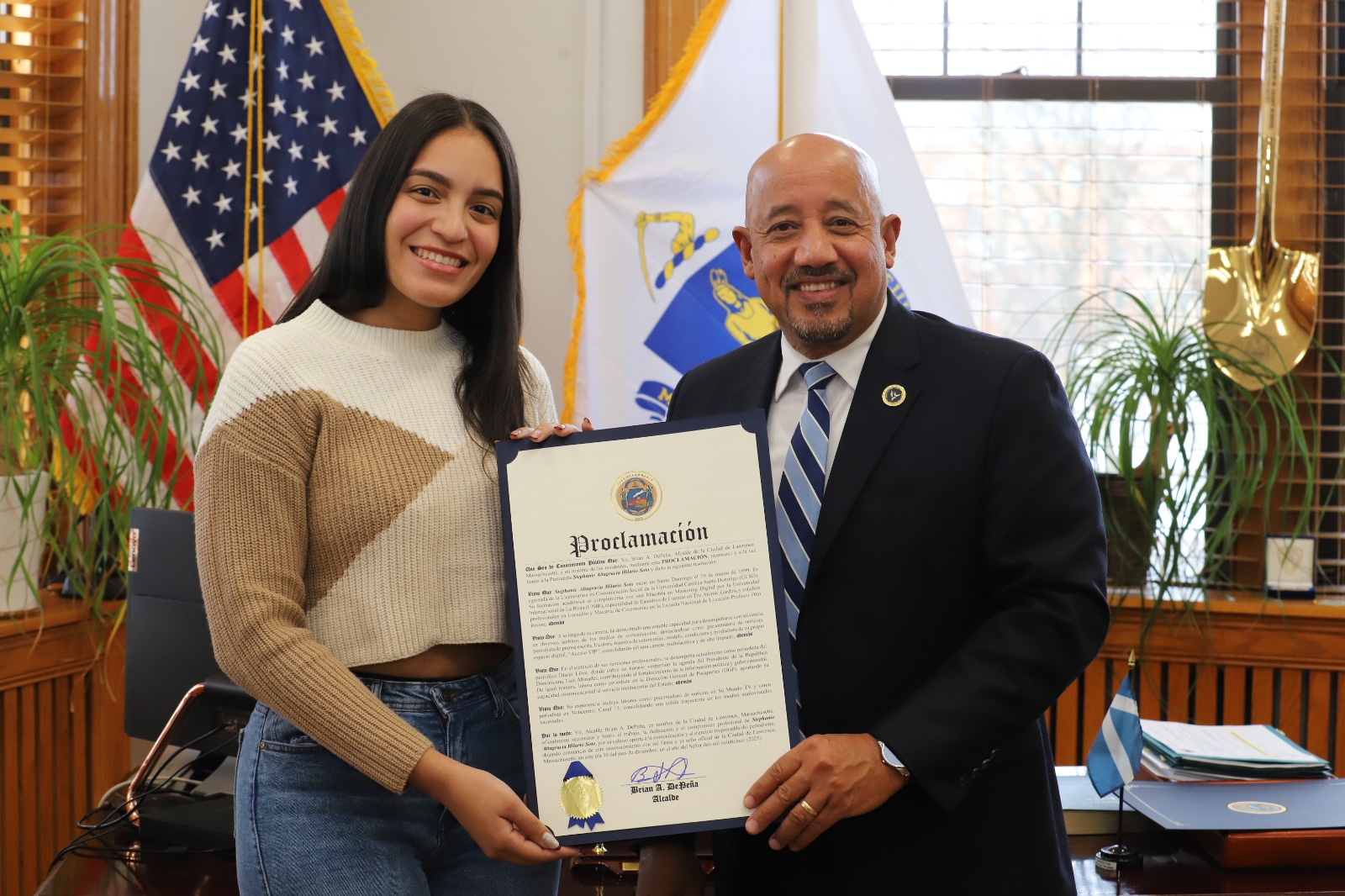 LAWRENCE, MASSACHUSETTS.-El alcalde de la ciudad de Lawrence, Brian De Peña, reconoció mediante una proclamación a la periodista Stephanie Hilario Soto, por su compromiso y aportes al ejercicio responsable del periodismo, así como por su desempeño en los medios de comunicación dominicanos.