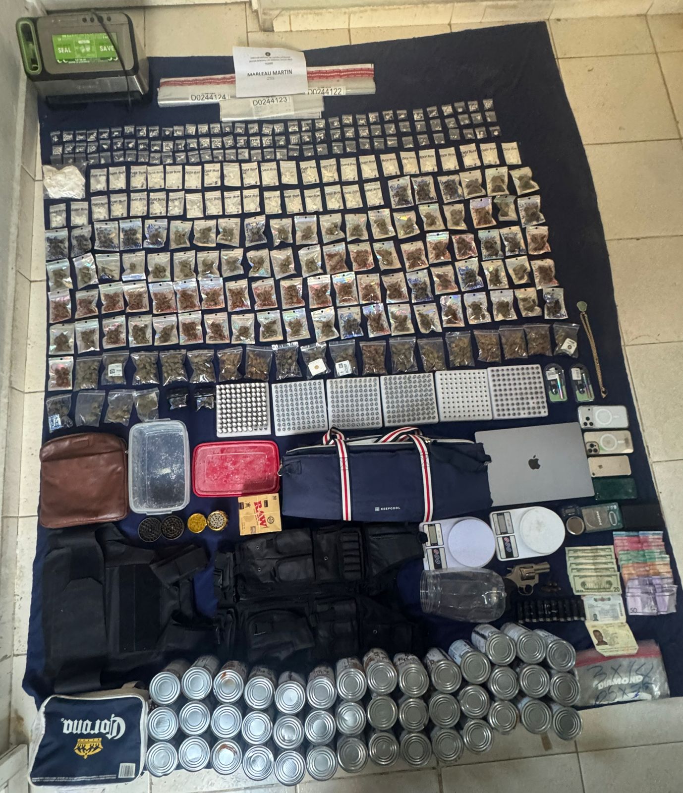 Se ocuparon también, 100 cigarrillos electrónicos, llenos de un líquido presumiblemente marihuana, 300 cartuchos, 200 boquillas, dos baterías para vapers, 63 latas llenas de un fluido desconocido, 02 trituradoras, 05 balanzas y un chaleco antibalas.