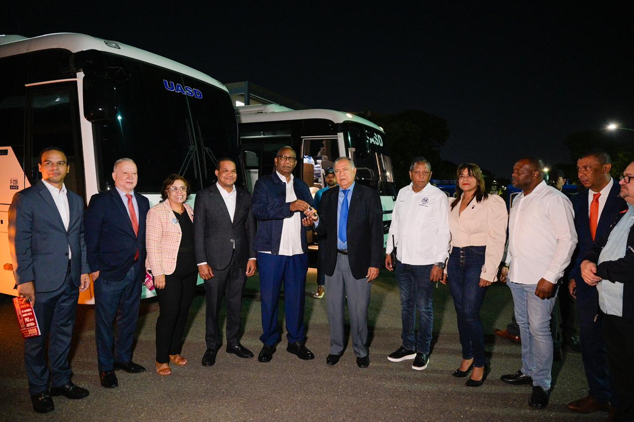 SANTO DOMINGO.-El rector de la Universidad Autónoma de Santo Domingo (UASD), Editrudis Beltrán, encabezó este jueves el acto de entrega de autobuses y vehículos en la Sede Central como parte de las acciones orientadas a fortalecer la movilidad, la seguridad y el bienestar de la comunidad universitaria, en el marco del proceso de modernización institucional que impulsa la actual gestión académica.