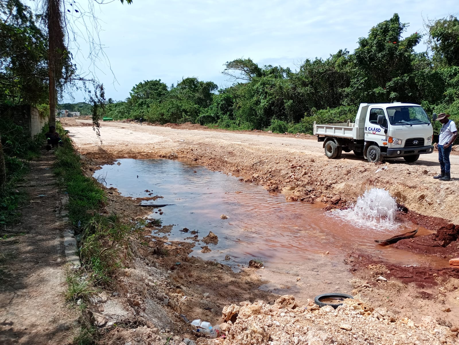En tanto que una brigada de la CAASD fue enviada por el ingeniero Fellito Suberví a corregir una avería en una línea de 8 pulgadas en las proximidades del Kilómetro 9 de la Autopista Juan Pablo Duarte frente al destacamento de la Policía Nacional.