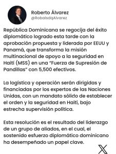 SANTO DOMINGO.-El canciller de la República Dominicana, Roberto Álvarez, manifestó a través de su cuenta oficial X, su regocijo por el éxito diplomático logrado la tarde de este martes con la aprobación propuesta liderada por Estados Unidos y Panamá que transforma la Misión Multinacional de apoyo a la seguridad en Haití MSS es una Fuerza de Supresión de Pandillas, con 5,500 efectivos.