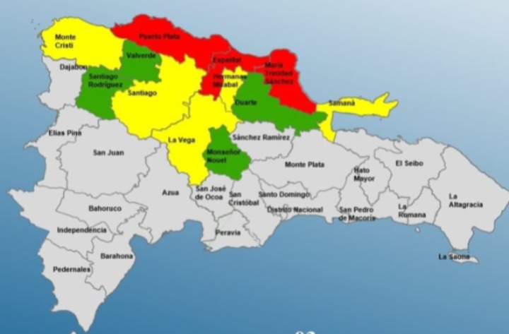Mientras que en alerta amarilla son: Santiago, Hermanas Mirabal, Monte Cristi, Samaná y
