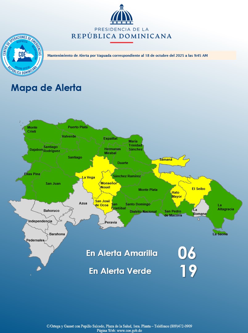 Las provincias en alerta amarilla son: La Vega, Monseñor Nouel, Samaná, San José de Ocoa, El Seibo y Hato Mayor. Mientras que en alerta verde permanecen Puerto Plata, Valverde, Santiago Rodríguez, Monte Cristi, Dajabón, María Trinidad Sánchez, Duarte, Espaillat, Hermanas Mirabal, Santiago, Monte Plata, San Cristóbal, San Pedro de Macorís, Distrito Nacional, Santo Domingo, Sánchez Ramírez y Elías Piña, entre otras .