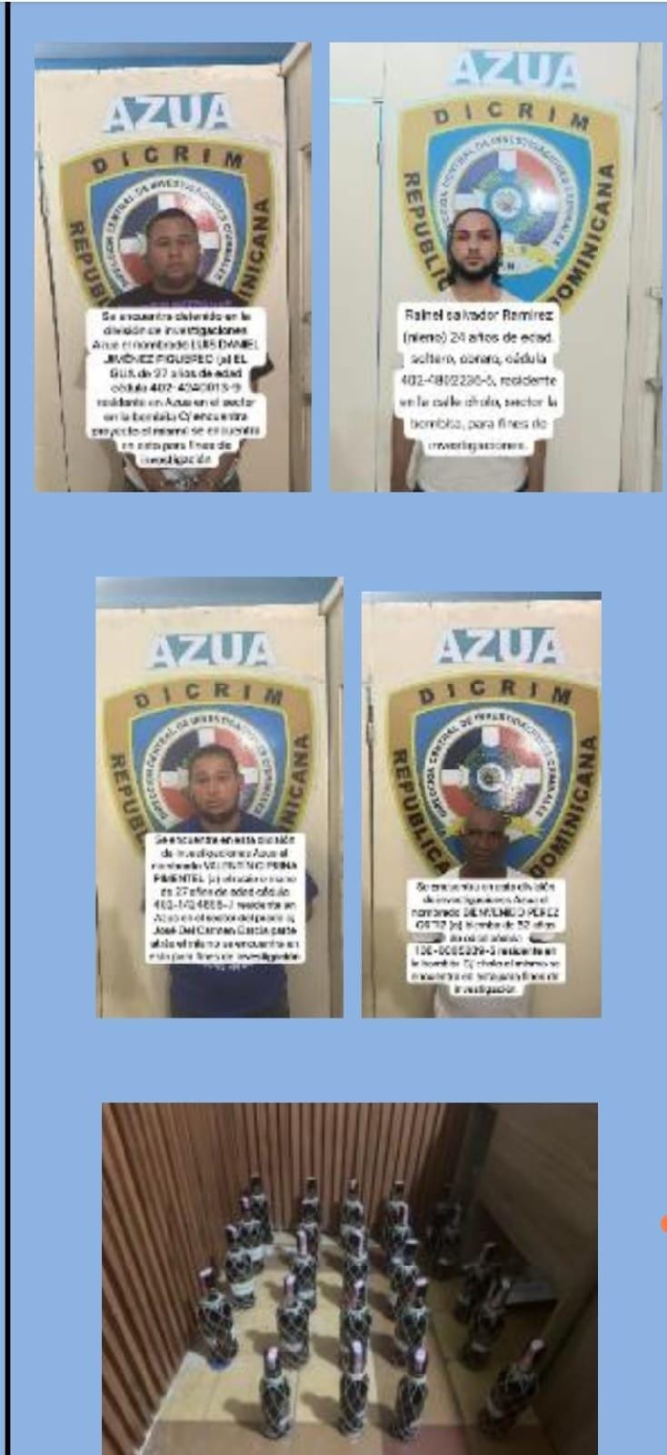 AZUA.- Miembros de la División de Investigación (DICRIM) en Azua apresaron en flagrante delito a varios individuos durante operativos de supervisión e investigación realizados en distintos sectores de la provincia.