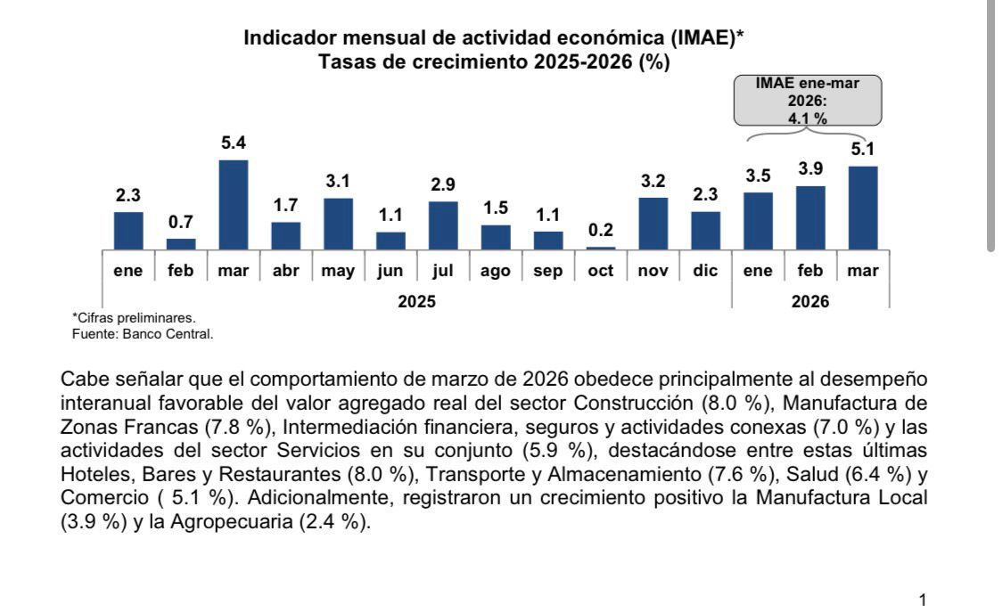 Las cifras preliminares del indicador mensual de actividad económica (IMAE) del mes de marzo de 2026 reflejaron un incremento interanual de 5.1 %, constituyendo el ritmo de expansión de la actividad económica más elevado de los últimos once meses. Con este resultado, el crecimiento promedio acumulado durante el primer trimestre del año se sitúa en 4.1 %.