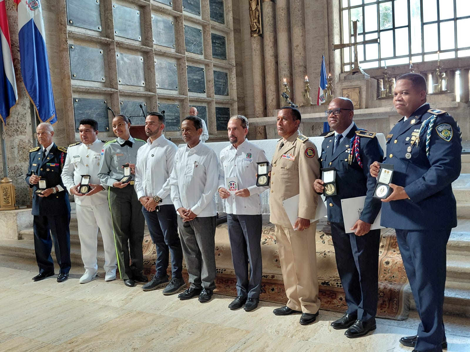 Luego de la eucaristía el señor Gustavo Ubrí, director del Panteón de la Patria y Juan Pablo Uribe, les entregaron a los cuerpos castrenses de las Fuerzas Armadas Dominicana, la medalla conmemorativa de María Trinidad Sánchez, como muestra de gratitud al apoyo incondicional y patriótico de los mismos a los rituales y celebraciones eucarísticas que se han realizado durante el año 2025.