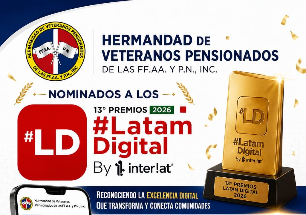 SANTO DOMINGO.-. La Hermandad de Veteranos Pensionados de las Fuerzas Armadas y la Policía Nacional de la República Dominicana fue seleccionada como nominada finalista en tres categorías de los 13.º Premios #LatamDigital 2026 by Interlat, importante reconocimiento regional que destaca proyectos, campañas e iniciativas de alto impacto en transformación digital, innovación, comunicación estratégica, uso de datos, marketing digital e impacto social en América Latina.
