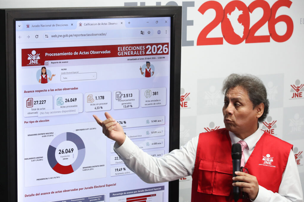Valdivia detalló que actualmente existen más de 65.000 actas de votación observadas, de las cuales unas 27.000 ya han sido remitidas a los Jurados Electorales Especiales (JEE), encargados de resolver en primera instancia. De ese total, cerca del 19% corresponde a actas presidenciales, es decir, más de 5.000 documentos en revisión.