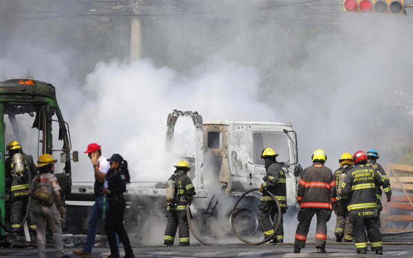 Integrantes del Cuerpo de Bomberos de Guadalajara intentan apagar un vehículo incendiado este domingo, en Guadalajara (México). EFE/ Francisco Guasco