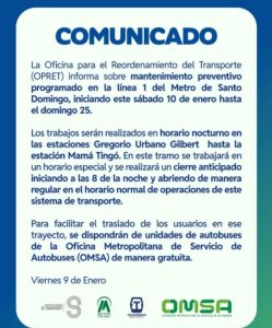 Según un comunicado, los trabajos se realizarán entre las estaciones Gregorio Urbano Gilbert hasta la Mamá Tingó desde las 8:00 de la noche y abrirá en su horario normal sus operaciones de este sistema de transporte.