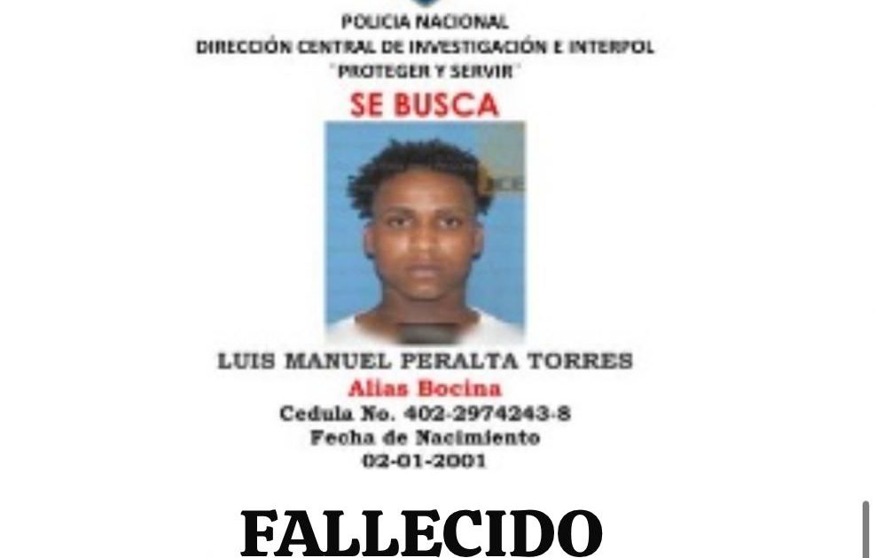 SANTO DOMINGO.-La Policía Nacional informó que cayó abatido la noche del martes Luis Manuel Peralta Torres, alias “Bocina”, de 25 años, quien era activamente buscado mediante orden de arresto por su presunta implicación en el homicidio del menor Juan Miguel de León Recio, ocurrido el pasado 8 de febrero en el sector El Oxígeno, municipio Pedro Brand.