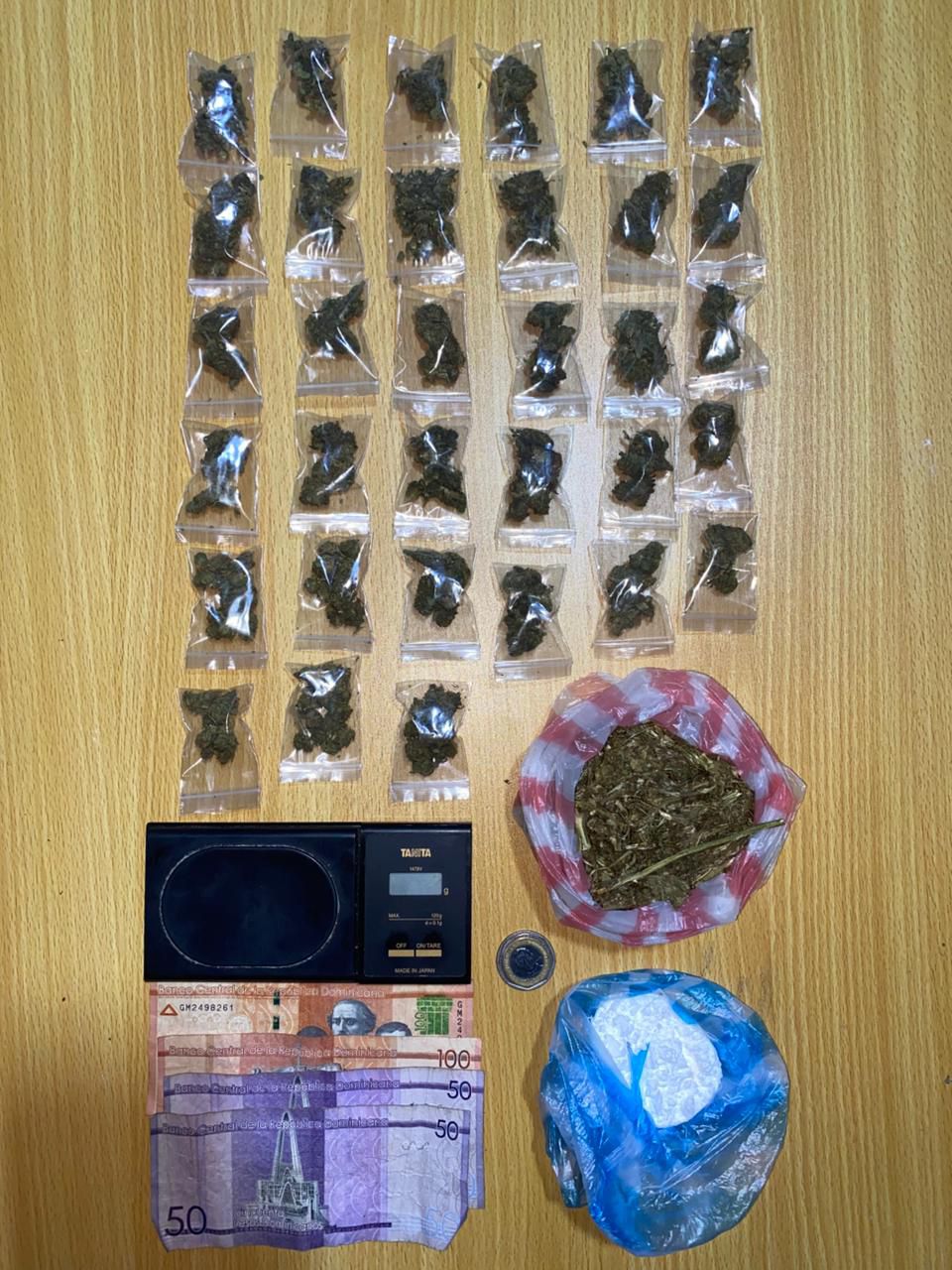 SANTO DOMINGO NORTE.- Agentes Policiales adscritos a la Dirección Regional Santo Domingo Norte, con asiento en Villa Mella desmantelaron lugares dedicados al microtráfico de sustancias controladas, uno ubicado en la calle principal de Licey sector Punta y otro en la calle 42 del barrio Mata San Juan decomisando 80 porciones de un vegetal verde presumiblemente marihuana y de un polvo blanco presumiblemente cocaina, balanzas y dinero en efectivo.