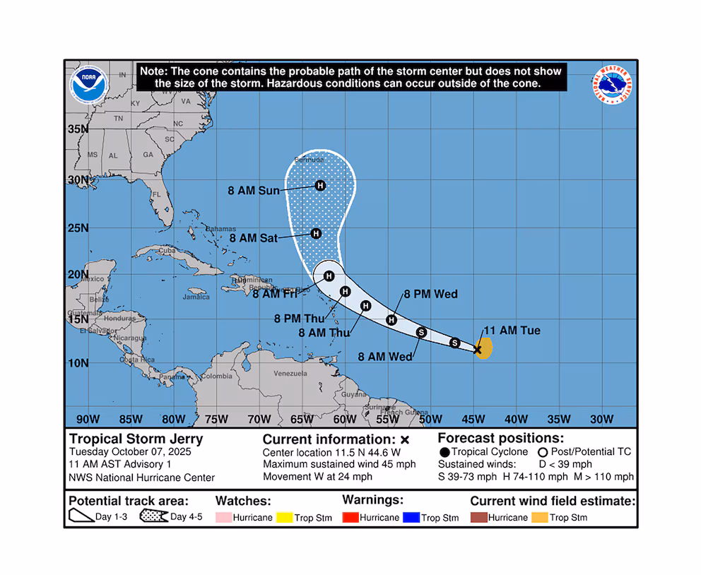 Los primeros avisos oficiales emitidos por el Centro Nacional de Huracanes indicaron que Jerry se mueve con rapidez en dirección oeste-noroeste a través del Atlántico central. Los pronósticos oficiales muestran que el sistema podrá aproximarse o posicionarse al norte de las islas de Sotavento entre el jueves 9 y el viernes 10 de octubre, según lo detalló el NHC en sus informes técnicos actualizados.