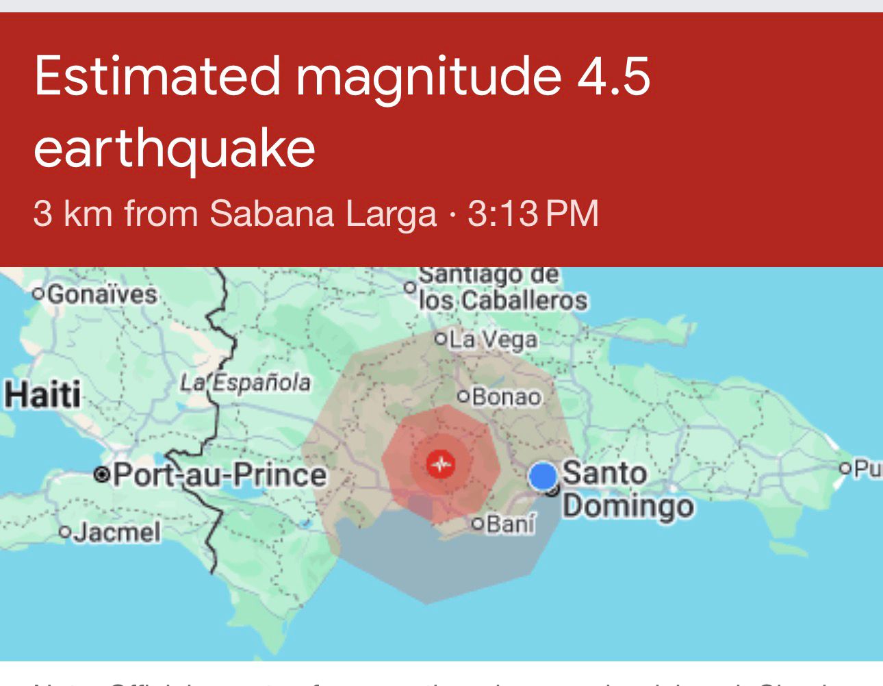 SANTO DOMINGO.-Este lunes a las 3:13 se reportó un temblor de magnitud 4.5 con epicentro a tres kilómetros de Sabana Larga, provincia de San José de Ocoa.