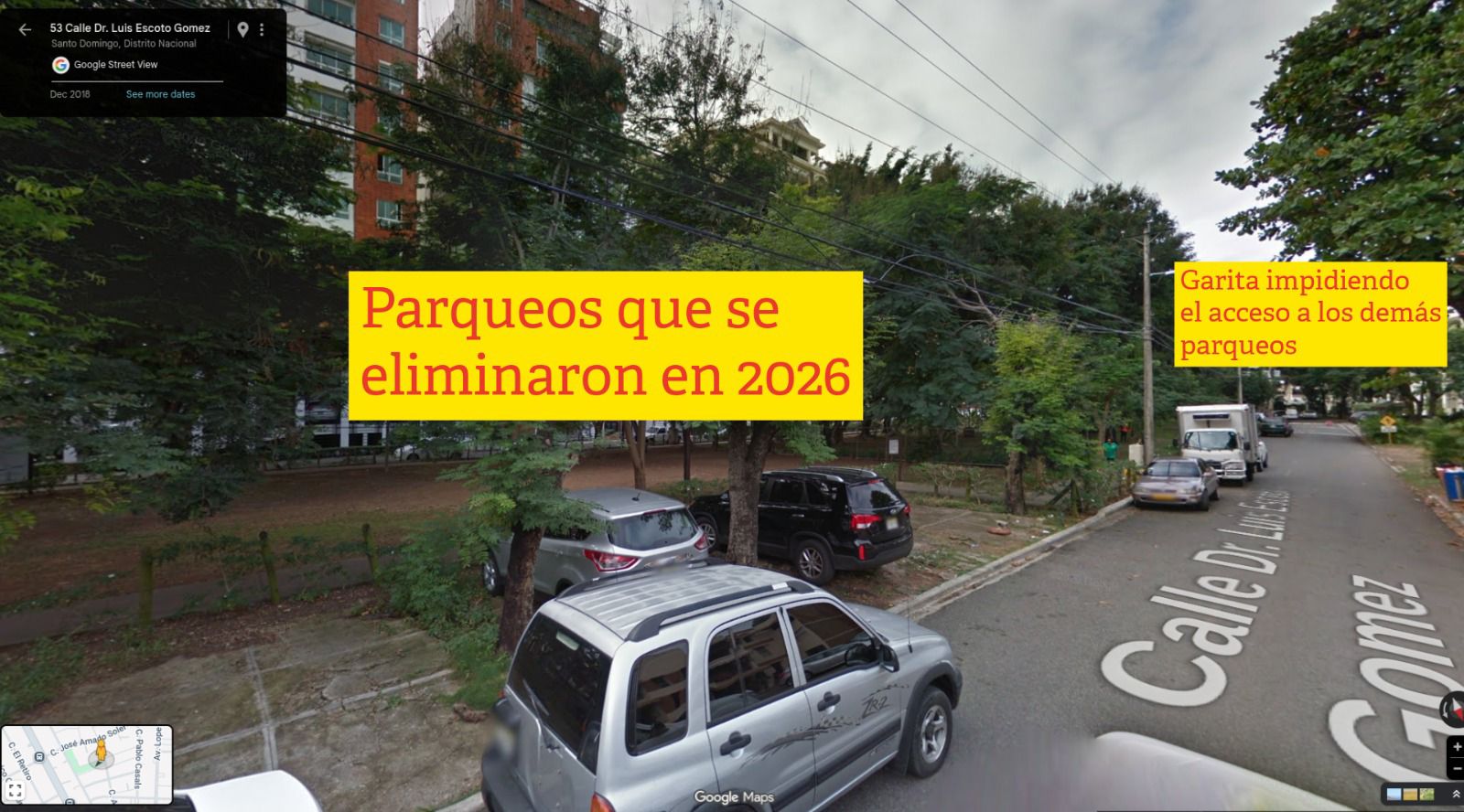 La inquietud aumentó a inicios de 2026 tras la eliminación física de seis parqueos que eran utilizados de manera abierta por la comunidad. Ante este escenario, fue depositada la denuncia número 26011301 ante la Defensoría y Uso de Espacios Públicos del ADN, institución competente en la regulación, protección y administración del espacio público en el Distrito Nacional.